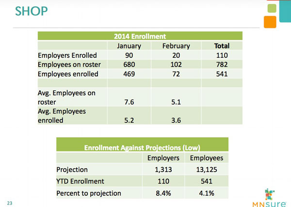 In addition, Minnesota's SHOP (Small Business) exchange tally has gone up a bit as well, to 541 employees covered; multiplying this by a conservative average of 1.8 per employee household brings it up to around 974 people covered by MN SHOP plans.
