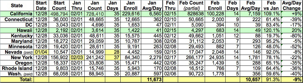 IMPORTANT: This also shows how volatile the performances between the different states are in February--Kentucky is currently enrolling people at 20% of their January rate, while California and Hawaii are outperforming January. Lousy February numbers from big states like Florida, Texas or Illinois could still drag these numbers back down again...while overperforming numbers could potentially pull it closer to the million mark.