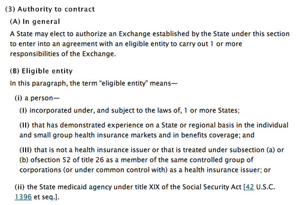 Well, according to McIntyre, they'd have to set up some sort of techical "eligible entity" via an "incorporated" person with healthcare insurance experience (but who isn't an insurer themselves), or some subsection of their Medicaid agency. Neither of these would seem to be too big of a deal.