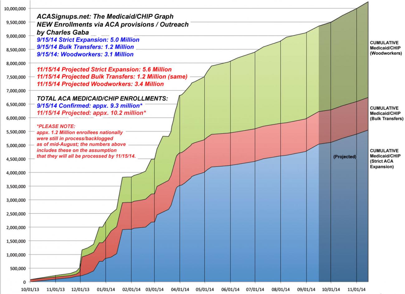 Now I've added the other half of the revamped graph: ACA-enabled Medicaid/CHIP enrollments. Like the QHP graph, there are 3 color-coded sections, but in this case they represent "Strict ACA Expansion" (people who are only eligible for Medicaid/CHIP due to the income provisions within the law in half the states); "Bulk Transfers" (ie, transferred from existing state-run programs such as LIHP in California, Commonwealth Care in Massachusetts, etc. due to ACA provisions) and "Woodworkers" (people who were already eligible for Medicaid prior to the expansion provisions, but who never enrolled before due to either being unaware of their eligibility, not understanding the process, etc). "Woodworkers" are folks who have been "drawn out of the woodwork" since last October thanks to a robust outreach program by the government and affiliated nonprofits, as well as a streamlined enrollment process and other measures.