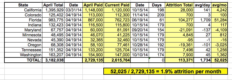 There's something else extremely important to note: Take a look at Florida. Then take a look at the total attrition at the bottom (both total and average). Notice anything? That's right: Florida accounts for virtually all of the attrition to date. In fact, when broken out by monthly average, you can see that if you remove Florida from the picture, there'd be a net gain of 180 enrollees per month...which is right in line with the August 15 national total (7.3 million) being higher than the number who likely paid out of the original 8.02 million enrollees (around 7.06 million).