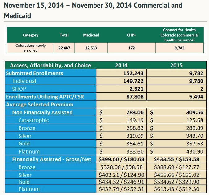 Colorado's first official enrollment report is simple, to the point, and includes not only new Medicaid/CHIP data after all (I was concerned that they'd stopped doing so, but apparently not), but also includes a handy 2015 vs. 2014 comparison chart, the SHOP number and even the number of QHP enrollees receiving tax credits/cost sharing!