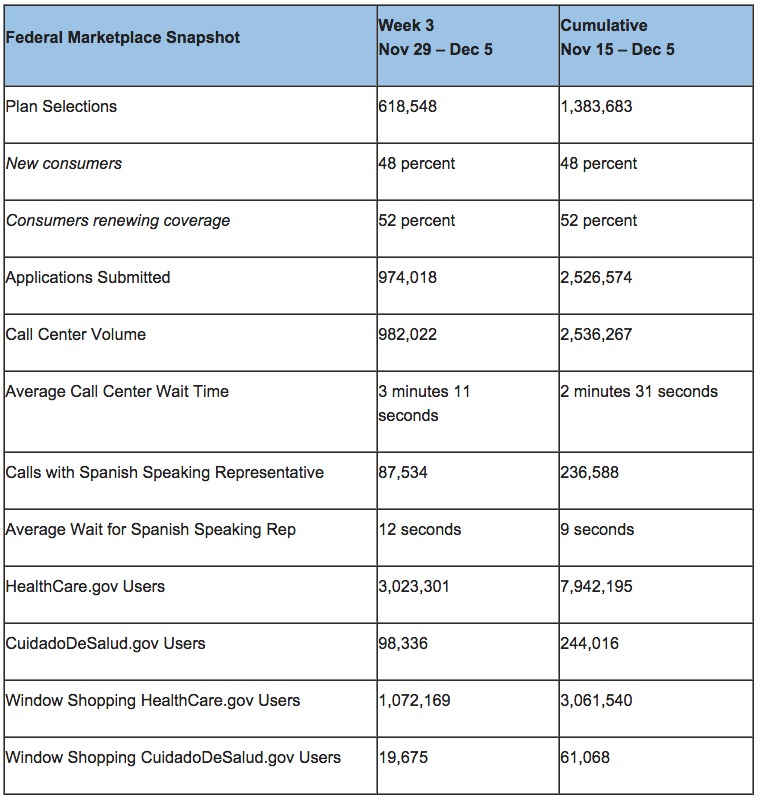 The most recent official data point given was HHS's announcement of 765,135 plan selections as of 11/28 via HealthCare.Gov. They also announced that 48% of those were new enrollees, or around 367,000 people in the first 2 weeks of open enrollment.