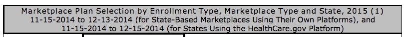 • Oregon: Yes, I know they're running off of HC.gov this year anyway, but the state of Oregon has been running weekly reports on 2015 enrollments (both on and off-exchange) anyway...and something doesn't add up. Just a few hours ago, the Oregon Dept. of Consumer & Business Services reported 67,467 private policy enrollments through Healthcare.Gov between 11/15 - 12/21. They specify that this does not distinguish between paid or unpaid enrollments.