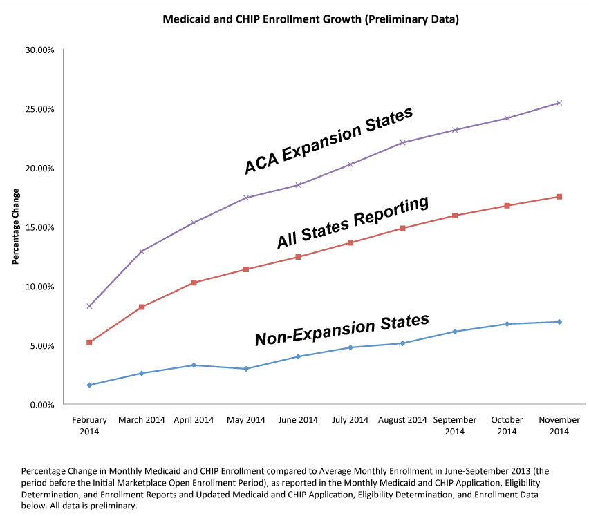 • Among states that had implemented the Medicaid expansion and were covering newly eligible adults in November 2014, Medicaid and CHIP enrollment rose by nearly 25.5 percent compared to the July-September 2013 baseline period, while states that have not, to date, expanded Medicaid reported an increase of approximately 7 percent over the same period.