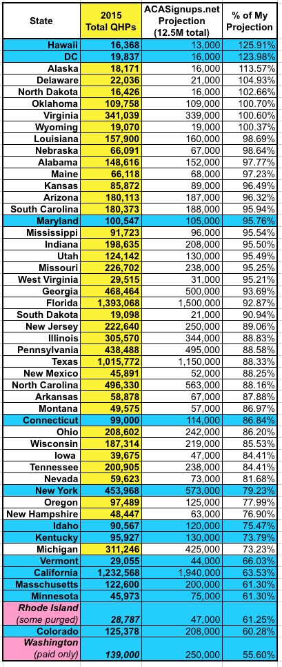 3) For Rhode Island and Washington, I'm using a different number than the other states; RI is the QHP selections, but after past-due non-paid ones have been purged from the total; in WA, they're only reporting the paid QHPs at all, so I don't know what the total selections are to begin with.