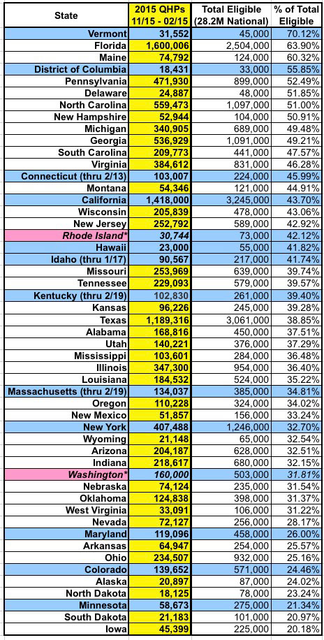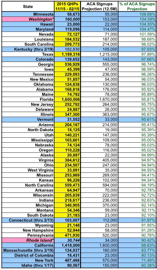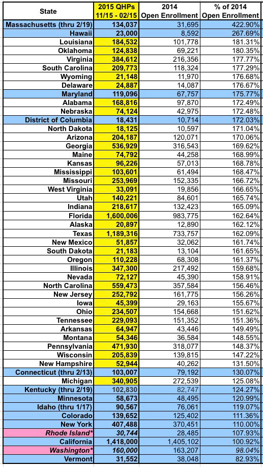 2015 QHP Enrollment Period vs. "Official" HHS Dept./State Exchange Projections: Hawaii is the biggest surprise here. They performed pathetically last year, even considering their small population and smaller uninsured rate...but unlike Maryland or Massachusetts, their technical woes didn't lead to a wholesale overhaul (or abandoning ship for HC.gov like Oregon and Nevada did). I don't know what anyone else was expecting out of the Aloha state, but I don't think anyone expected them to more than double the official target. Similarly, Alaska wasn't expected to do well since they're one of the few states where exchange policy premium rates really did skyrocket, due to the nature of their market. However, for sheer numbers, Florida is a jaw-dropper: Over 1.6 million enrollments...11% more than 2014 king California, even though CA has nearly double the population. And remember, with an extra week of potential "In Line by Midnight" additions, Florida could potentially break 1.7 million in the end. The bottom of the list is again composed of the same batch of state-based exchanges. Again, the missing data and other caveats apply, with one exception: New York. For whatever reason, the NY State of Health really thought they could nearly double last year's haul with 720K QHPs this time around; obviously that didn't happen. California is also looking to miss their target of 1.7 million, badly, even though that's only 21% higher than last year's tally. Hopefully the extra week of "In Line" additions will reduce the gap. On the up side, while Minnesota also missed their target, they came much closer than expected, and might even squeak by during the overtime period.