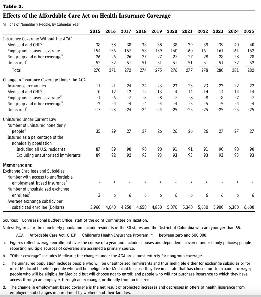 This means two things: First, the CBO is assuming that the Supreme Court will not kill off the federal exchange tax credits (if that happens, exchange enrollment would plummet to perhaps 3-4 million at most). I don't know if this is a sign of confidence on their part, or if they're simply not allowed to make assumptions about legal changes in the future--they probably have to make their projections based on the law as it stands today, and will only make such an adjustment in July if the SCOTUS does drop the bomb in June.