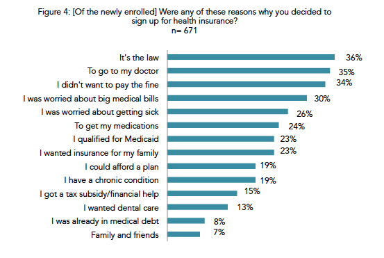 The other 60%, however, enrolled because of reasons like, say, having pre-existing conditions which meant they couldn't get enrolled prior to the law, not being able to afford it until now and so forth (admittedly, 34-36% did list the tax penalty/legal requirement as being among the reasons they enrolled):