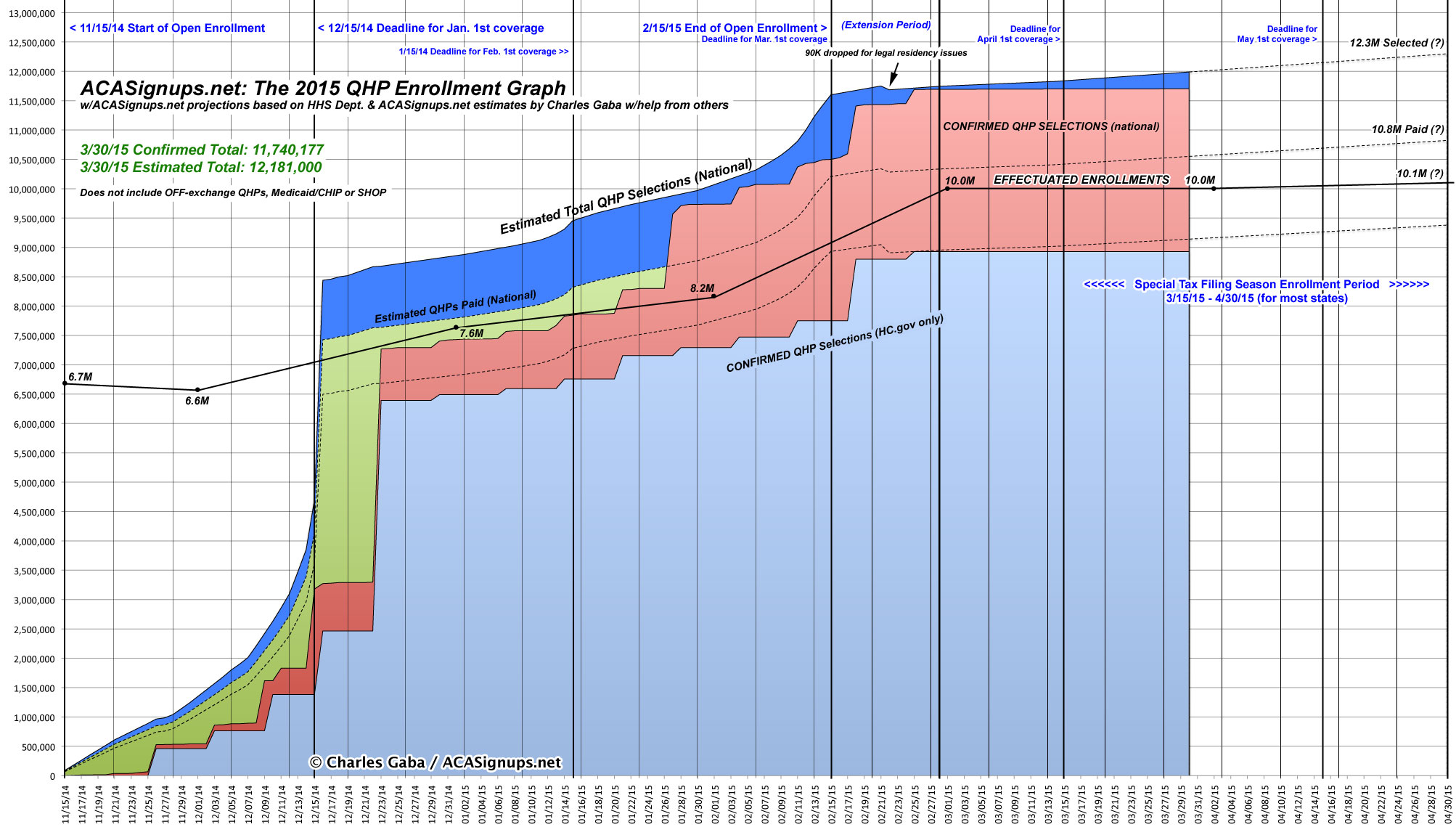 Instead, I'm now assuming total QHP selections will reach perhaps 12.3 million by April 30th (10.8 million paid), with effectuated enrollments hitting around 10.1 million on May 1st.