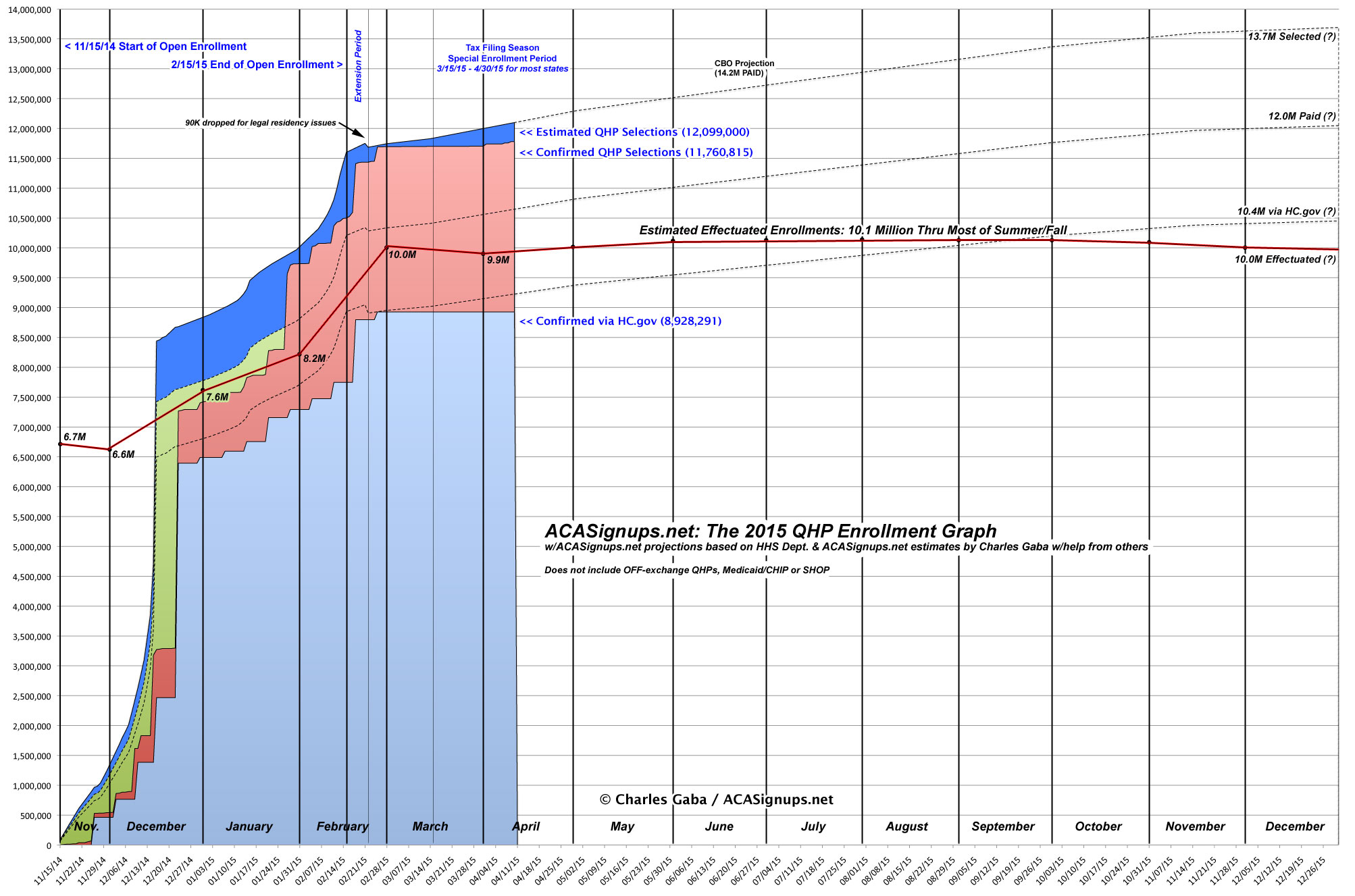 That major caveat aside, assuming that my (recently corrected) projections prove to be reasonably on the mark, this is what I'm expecting private QHP enrollments via the ACA exchanges to look like for the rest of 2015. The year should wrap up with roughly 13.7 million total QHP selections; of those, around 12.0 million will likely pay their first premium; and of those, roughly 10.0 million will likely still be enrolled (effectuated) as of December.