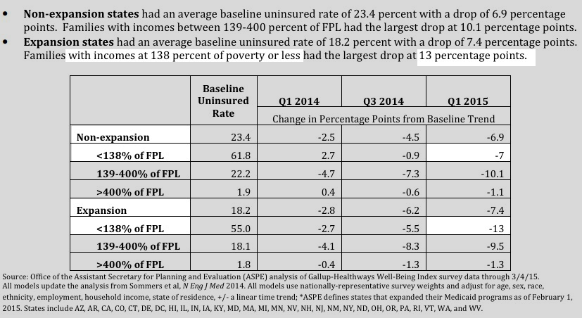 Do you see the problem? By wording it this way--and especially by not including the crucial comma between "...Medicaid program, for people with incomes below...", it makes it look as though she's referring to the entire state populations, with the "<138%" descriptor appearing to simply clarify the nature of the expansion in those states as opposed to referring to that particular subset only. In this context, a 13 point drop makes total sense, since the "<138%" population is precisely who Medicaid expansion was targeted at.