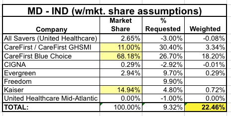 Kaiser Permanante is the 2nd largest insurer on the MD exchange with 15% of the enrollees and is only asking for a 4.8% increase...but again, I have no idea what their off-exchange enrollment is.