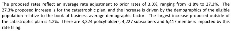 Again, they've combined individual and small group together in a single filing (must be a Vermont thing?), and again, this ranges from a reduction of 1.8% to an increase of 27.3%. As you can see, that eyebrow-raising 27.3% figure only applies to Catastrophic policies...which only 149 people are enrolled in anyway: