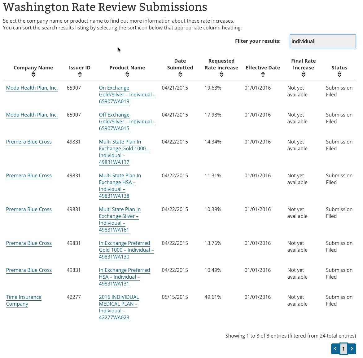 To reiterate: The Rate Review tool is handy for finding particular requests for particular plans from particular companies...but is completely useless for trying to figure out the overall requested rate changes in any particular state (unless every plan from every company happens to be listed for that state, which seems to be pretty rare).