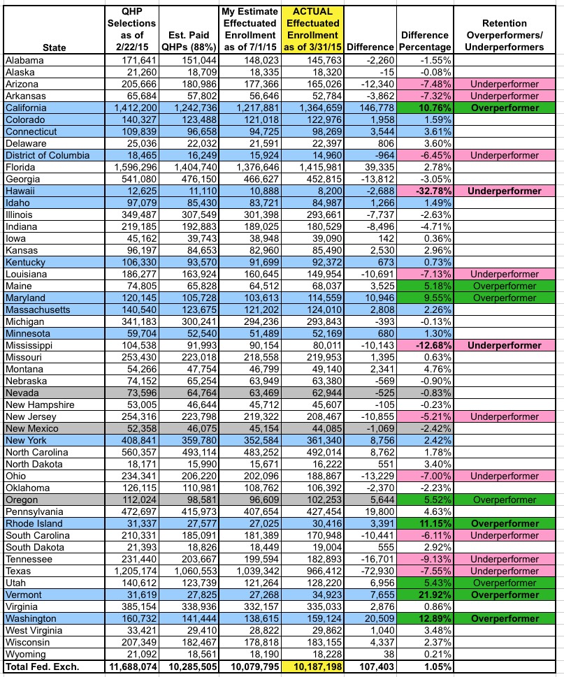 • California: +10.76%. Yes, I know, California severely underperformed during the actual open enrollment period. However, that's not what we're talking about here; I'm looking at what percentage of those who did enroll actually paid up and are sticking around, and on that basis it's a pleasant surprise: Over 140,000 more people than I had estimated. Let me put it this way: If CA hadn't overperformed here, my national estimate would be coming in 30K over instead of 110K under the actual number.