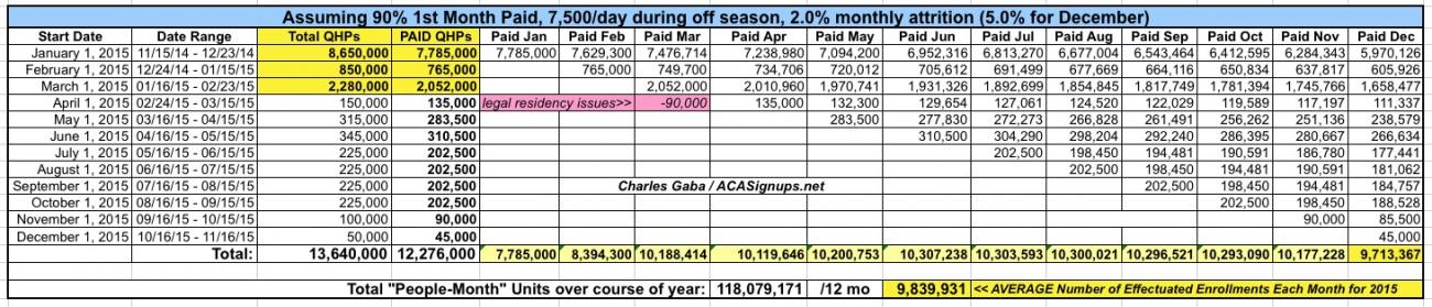 Here's the spreadsheets which explain where the monthly effectuated numbers come from. For the old version, I assumed an 88% payment rate, 2% monthly average net attrition and around 7,500 people enrolling during the off-season per day, plus about 140,000 tax filing-specific enrollments. As you can see, the effectuated March number is around 9.96 million: