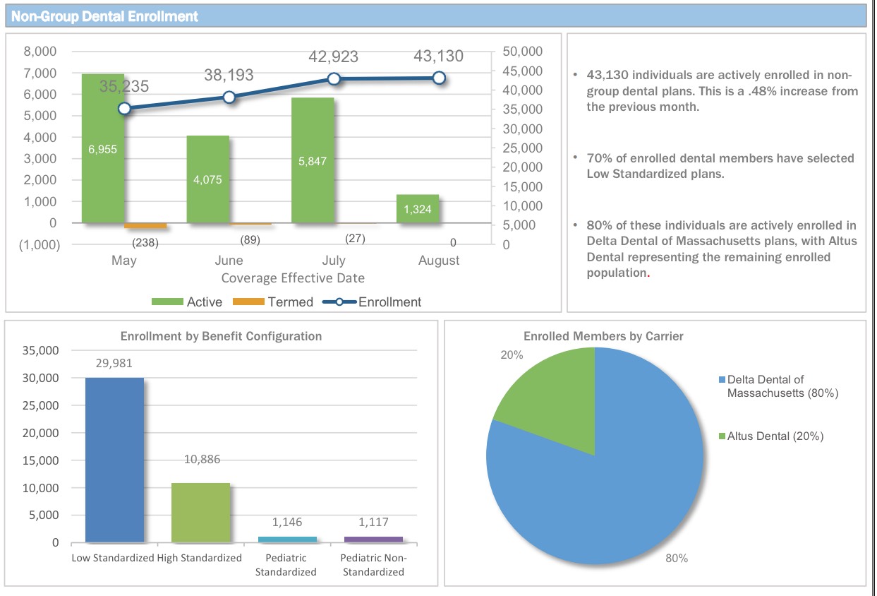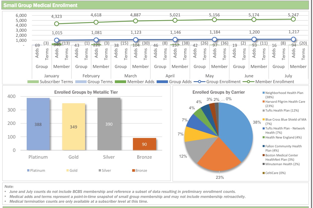 But wait, there's more! Look below and you'll see a whole mess of pie charts, bar charts and line charts, breaking out everything from Metal Level selections and Market Share by Provider to SHOP enrollments (5,247 lives covered as of July 1st) and even Dental Plans!