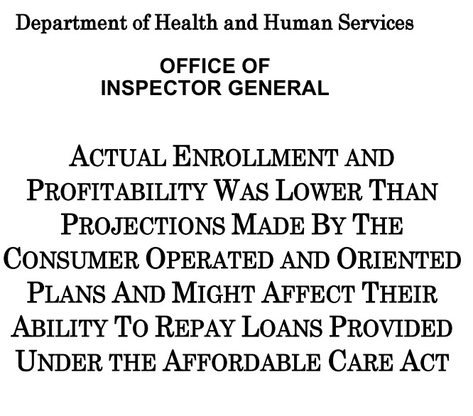 One of these (CoOportunity, which operated in Iowa and Nebraska) seemed to be kicking ass in 2014...but ended up being liquidated by the end of the year. A second, operating in Louisiana, just announced that they're shutting down operations by the end of this year. As the OIG report notes, most of the 21 other CO-OPs nationally aren't doing so hot...and they used an absurdly long title (with an absurdly New York Post-style font size) to say so: