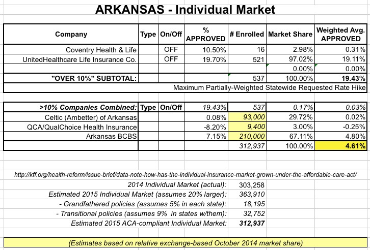 A couple of weeks ago I noted that only 2 AR companies even requested hikes of more than 10%, and only a few hundred people are currently enrolled in those policies anyway. Based on this, plus the informed opinion of local reporter David Ramsey (an expert on all things ACA-related in Arkansas), I projected a weighted average rate increase request of perhaps 4% overall.