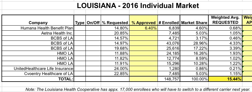 Louisiana's Insurance Dept. website is refreshingly complete: It includes every company on the individual & small group market, lists both the requested and approved rate hikes, and includes direct links to the filings which list the actual total enrollment in a clear-cut, consistent fashion.