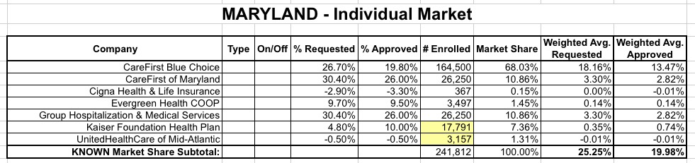 However, that still leaves the other three: Kaiser Foundation Health Plan, UnitedHealthcare of Mid-Atlantic and All Savers (which is actually a subsidiary of UHC, but lists separately). All three of these companies requested much lower rate changes (+4.8%, -0.5% and -3.2% respectively), and even with Kaiser being increased to a 10% hike still should lower the overall statewide average significantly...assuming the three have a significant combined market share.