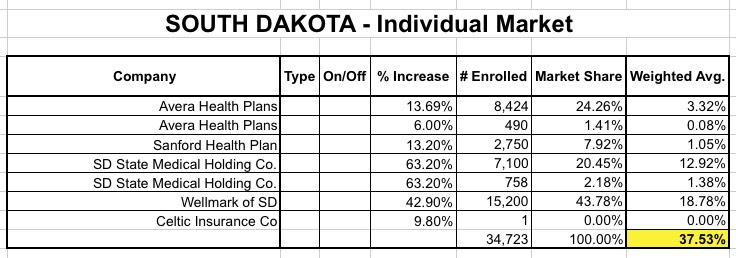A few weeks ago, I crunched the (minimal) enrollment/rate numbers for South Dakota and came up with a fairly ugly weighted average rate hike of 27.4% (ouch). Being such a small state & population, there are only 5 insurance companies total offering individual policies either or off the exchange: Avera, Sanford, Welmark, Celtic and SD State Medical Holding, otherwise known as "DAKOTACARE" for some reason (and no, I refuse to capitalize the whole thing in the headline).