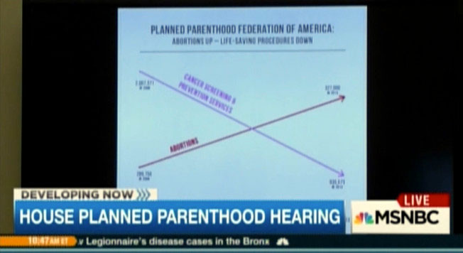 You can't read the actual numbers from the blurry screen shot, but from the the handy "arrows", it's safe to assume that Chaffetz is suggesting that "cancer screenings and prevention services" have taken a nosedive over the years (?) while abortions have increased at an equally dramatic rate.
