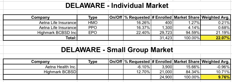 Highmark Blue Cross Blue Shield of Delaware initially requested an average rate increase of just over 25 percent in the individual market, although they increased their proposed rate increase to 33 percent in August.  State regulators ultimately approved a 22.4 percent average rate increase for Highmark’s individual market plans, but Highmark has almost 95 percent of the individual market share in Delaware, including both on and off-exchange enrollments.