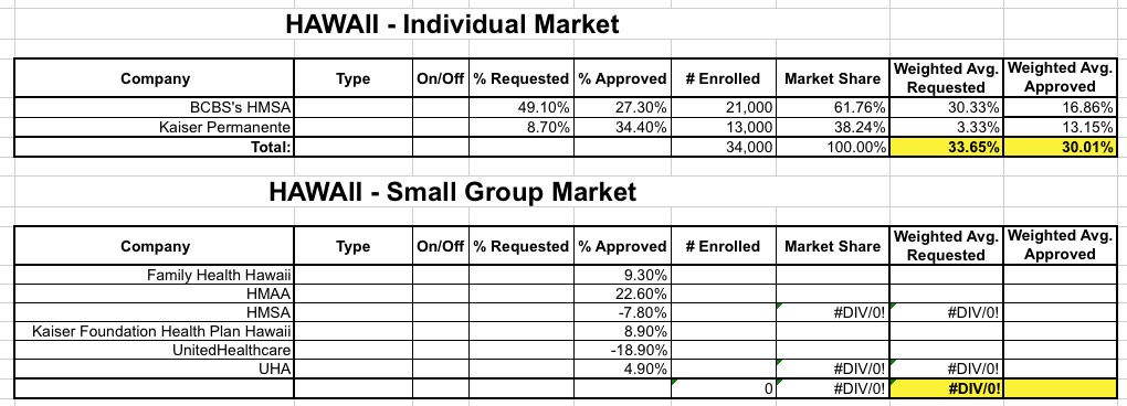 Hawaii was one of the first states I ran a weighted average rate increase for, way back in July. With only 2 insurance carriers offering individual market policies either on or off the ACA exchange, and a small membership to being with, it was pretty basic: