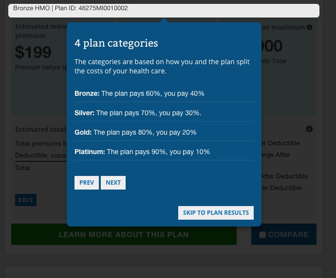 ...where they've added 4 new "Help Guides"...screen overlays to explain what the hell all of this stuff means (Copayments, Deductibles, Metal Levels and Out of Pocket vs. Premiums, as well as the Plan Filtering tool on the left sidebar):