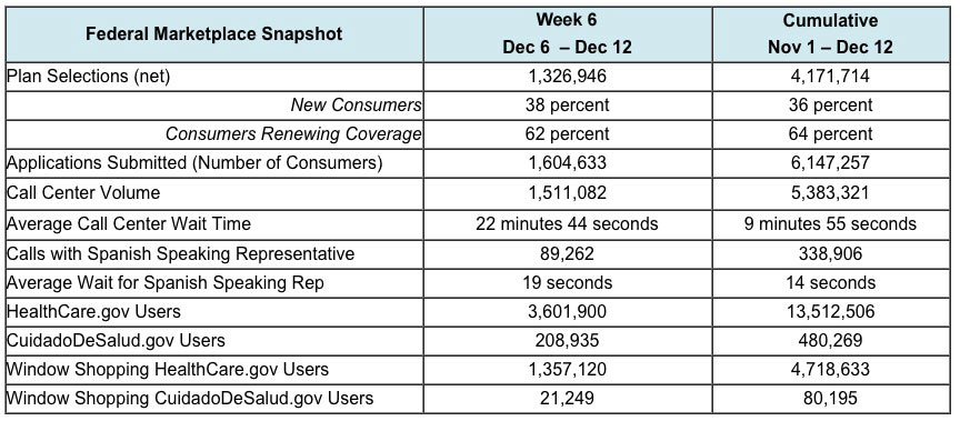 More than 1.3 million consumers signed-up for health coverage through the HealthCare.gov platform between December 6 and December 12, the last full week before the deadline for January 1 coverage, bringing the total number of plan selections made since Open Enrollment began on November 1 to 4.17 million consumers.  Approximately 500,000 were new consumers, for a cumulative total of about 1.5 million new consumers since the beginning of Open Enrollment.