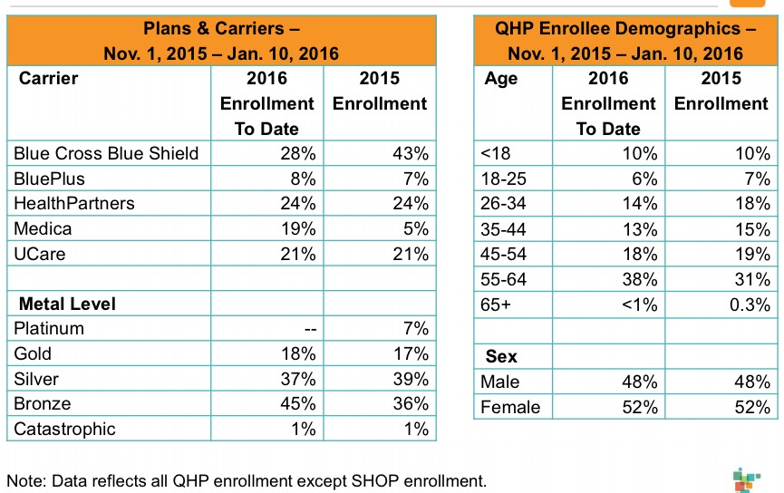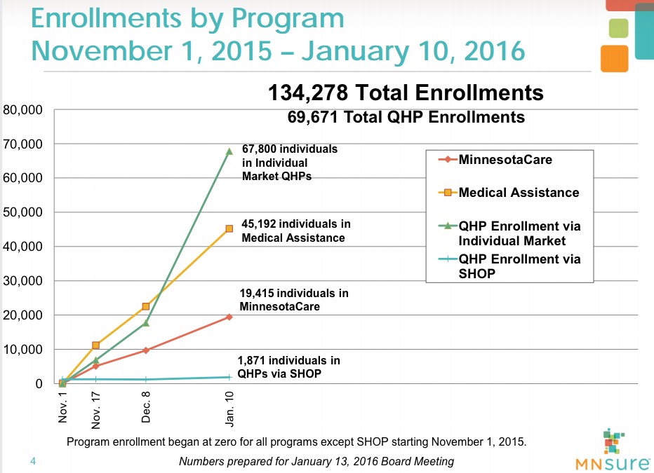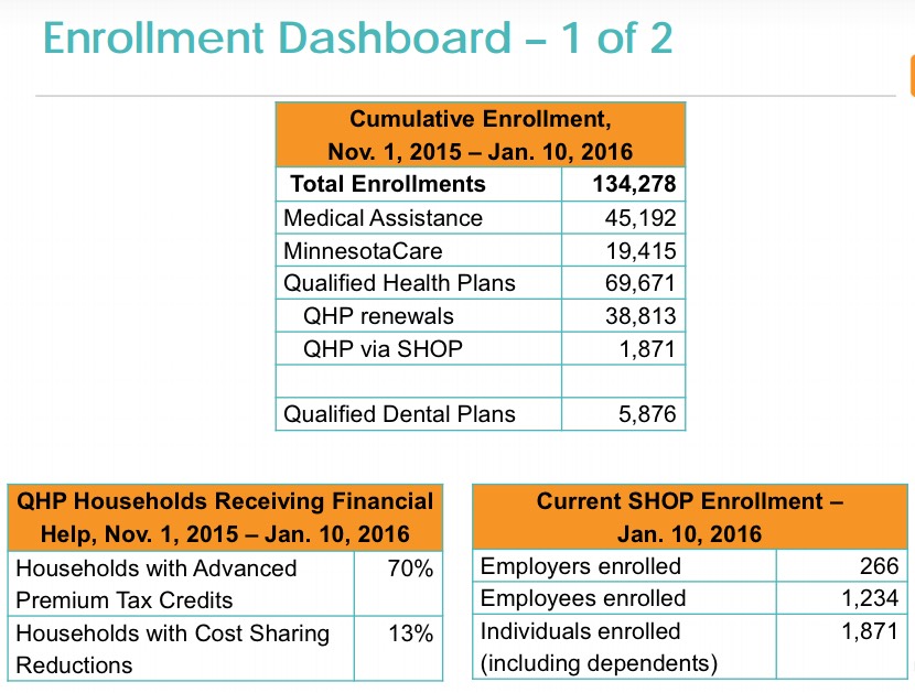 Minnesota held their monthly board meeting. At first glance, it looks like they've managed to add 1,991 QHPs since December 28th, which would be impressive...except that, as a later slide shows, 1,871 of these are due to including their SHOP (small business) enrollees in today's number versus these folks not being included in the news article a week or so ago.
