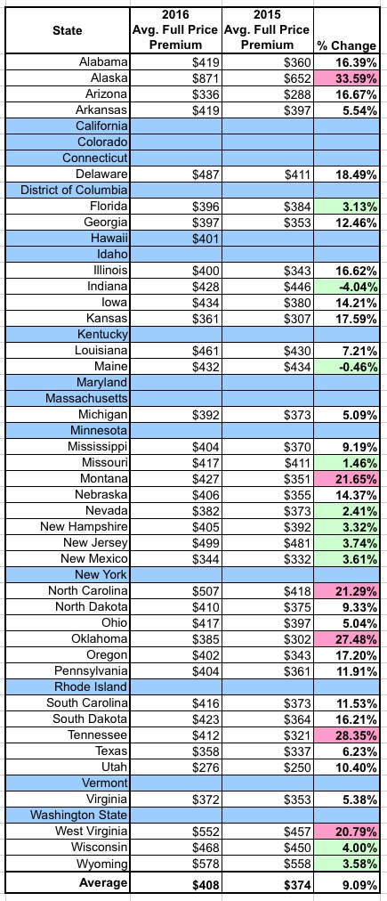 Here's how it breaks out state by state. It doesn't include the state-based exchanges like California, Colorado, etc, nor are any enrollees since 12/26 included, but it still gives a pretty good picture of the overall situation. As you can see, 6 states did get slammed with 20% or higher hikes (ouch), while 10 states came in with increases of less than 5%, and two of them (Indiana and Maine) actually have lower rates on average than last year.