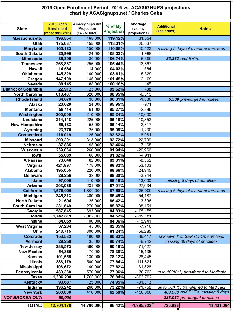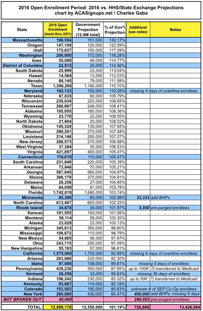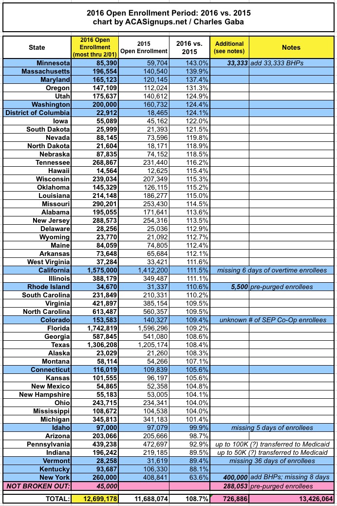 The three "M" exchanges (Minnesota, Maryland and Massachusetts) kicked some major ass this year, with each one enrolling more than 1/3 more people than 2015. Other strong performers (more than a 20% increase) were Oregon, Utah, Washington State, DC, Iowa and South Dakota, although Washington is a bit of a cheat since they actually did the reverse of HC.gov this year; they went from only counting paid enrollees to counting all selections. A true year/year comparison would likely be more like an 11% gain for WA.