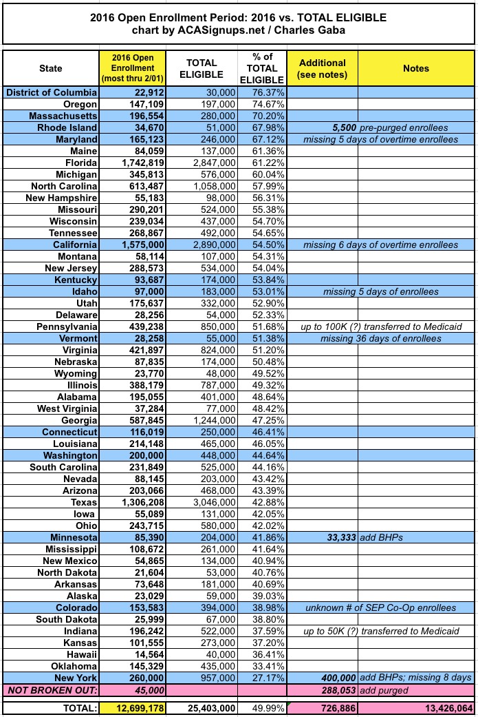 The biggest takeaway here is that the ACA exchanges did manage to enroll effectively 50% of the total number who are theoretically eligible to do so (whether subsidized or not), though this will likely drop to 40% assuming the HHS is correct about the end of year effectuation number dropping down to 10.0 million.