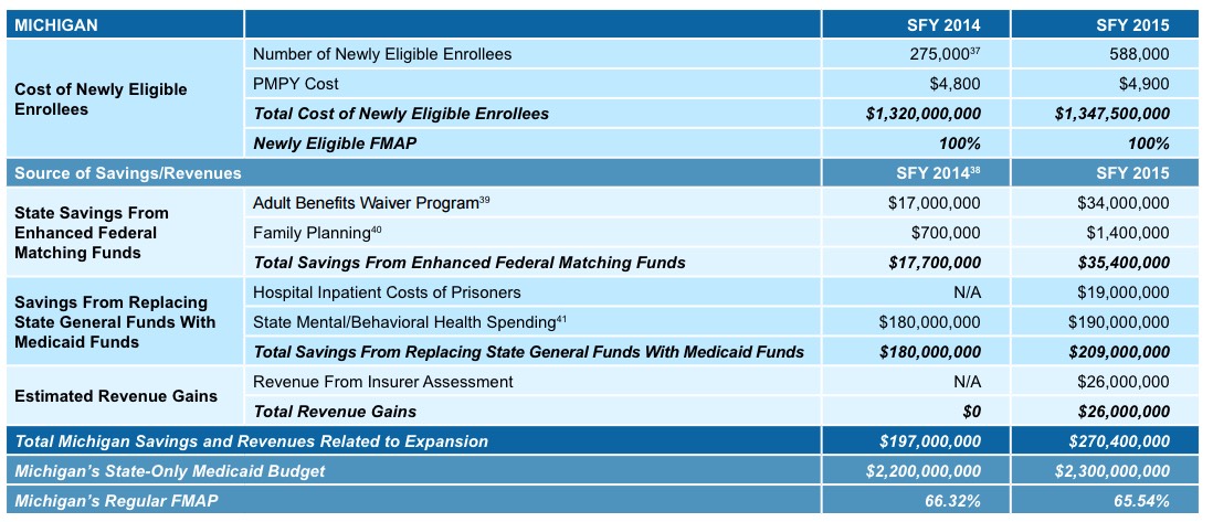 - Michigan projected savings of $190 million in SFY 2015 by transitioning enrollees in a state-funded program that provided targeted services for the seriously mentally ill into the new adult group.
