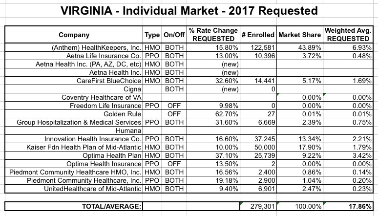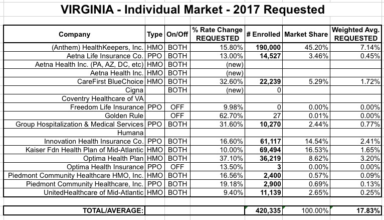 In light of today's confirmation that the average 2016 premium rate increase ended up only being appx. 8% nationally on the individual market (as opposed to the headlines screaming about 40%, 50%, 60%+ rate hikes being "typical"), I've decided to get a jump on the 2017 rate changes. Someone gave me a heads up that Virginia appears to be first out of the gate this year, with requested 2017 rate filings having already been submitted by at least 8 carriers.