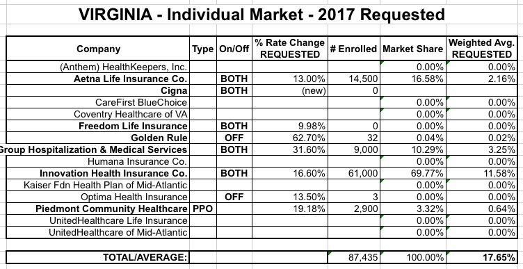 - Innovation Health: Innovation Health currently has around 61,000 enrollees. Last year they were among the few carriers to lower their rates on average; for 2017, however, they're requesting a weighted average rate hike of 16.6%, whle also adding 2 new silver plans. One other interesting tidbit is this bit on Page 6 of the cover letter, where they state that they expect 90% of their 2017 enrollments to be on-exchange with only 10% off-exchange.