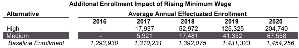 Here's a table showing their projections for the impact of CA's $15 minimum wage, which is being phased in over several years...looks like they're expecting up to 200,000 Californians currently on Medicaid to see their wages increase enough to kick them off of the program and onto subsidized private policies: