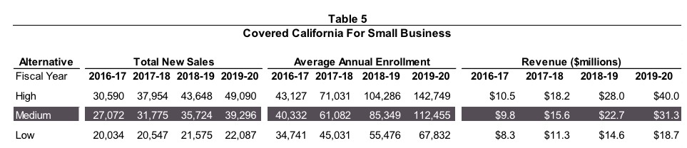 Wow. Considering that the national SHOP enrollment number is likely only around 120,000 or so at the moment, this is a hell of an optimistic projection--their mid-range is more than that by 2020 in California alone. Of course, extrapolated nationally that would still only be around 1 million people, but that would still be a good 8x increase over today.