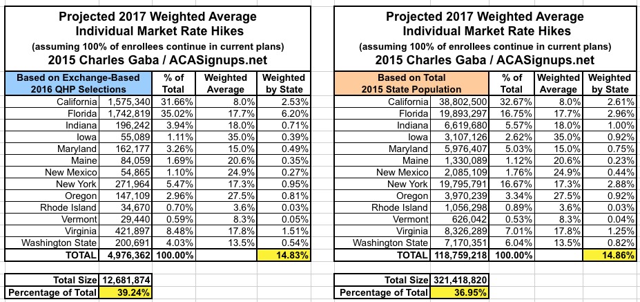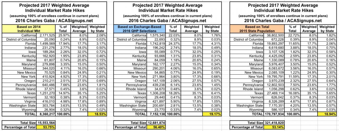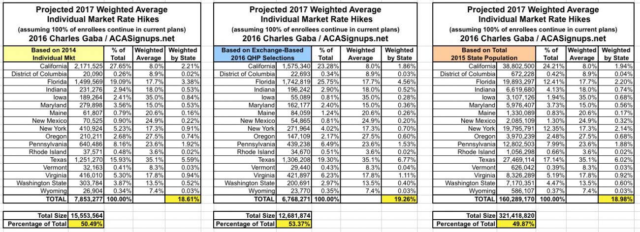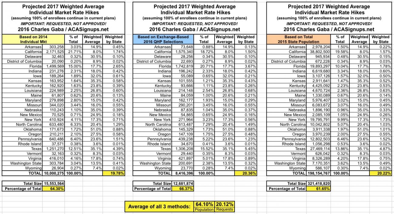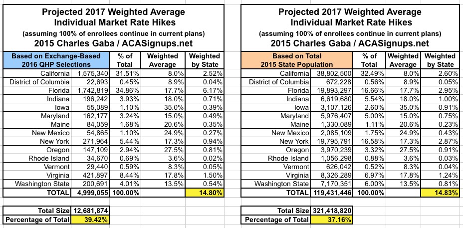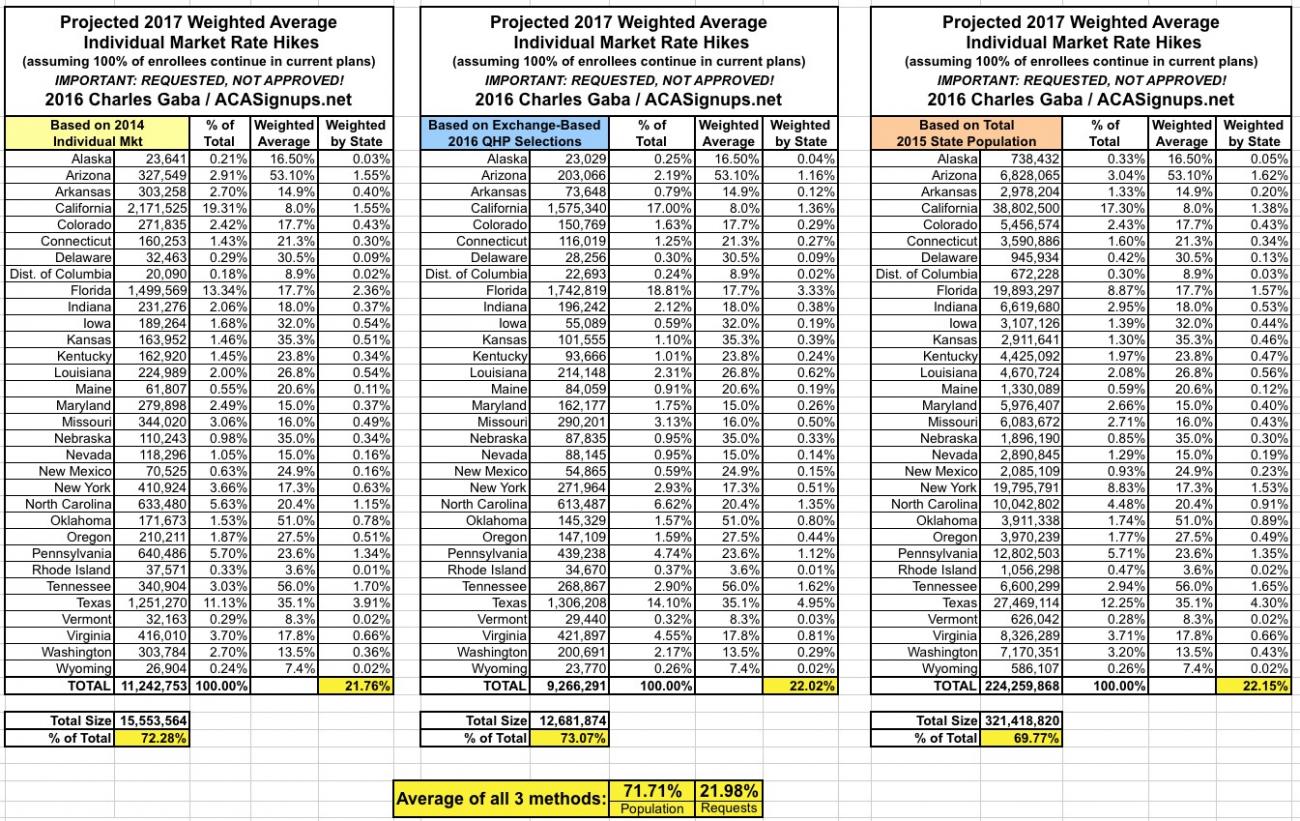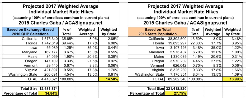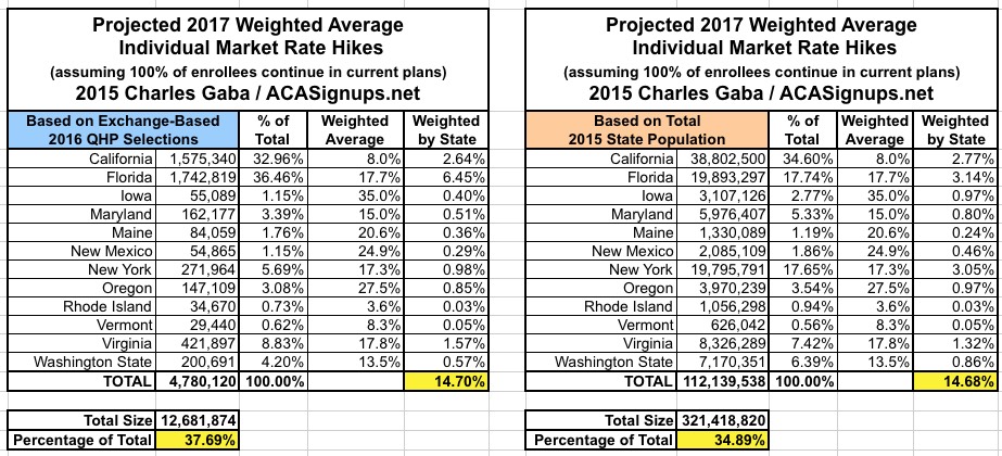Since there are a lot of demographic variables which can skew the "average" up or down for any given state, last year I plugged the averages for each state into tables and weighted them based on 3 different criteria: The total (on plus off-exchange) individual market (based on 2014 data); the total exchange-based QHP selections as of the end of Open Enrollment; and the total population of each state. However, the 2014 data is too outdated by now (the national indy market has grown from around 15.6 million to around 20-21 million by now), so until the Kaiser Family Foundation or another trusted source compiles 2015 data, I'm dropping that method. Besides, all three methods still hovered in the same 12-13% range last year anyway.