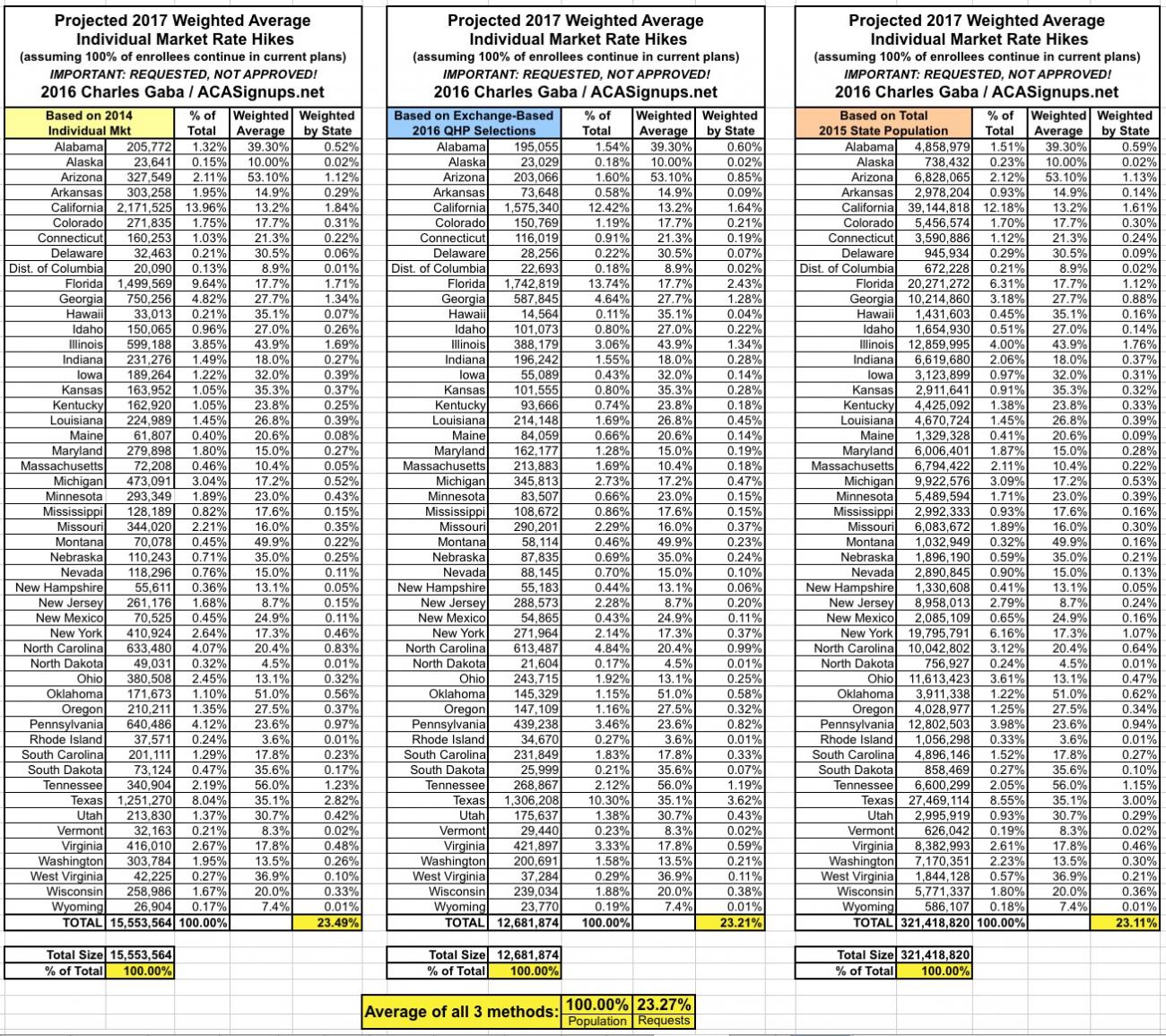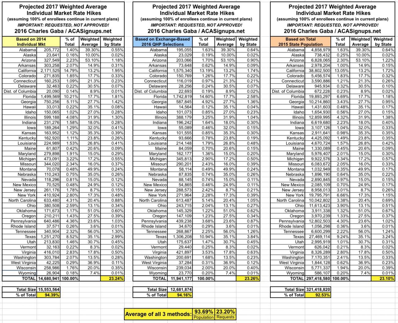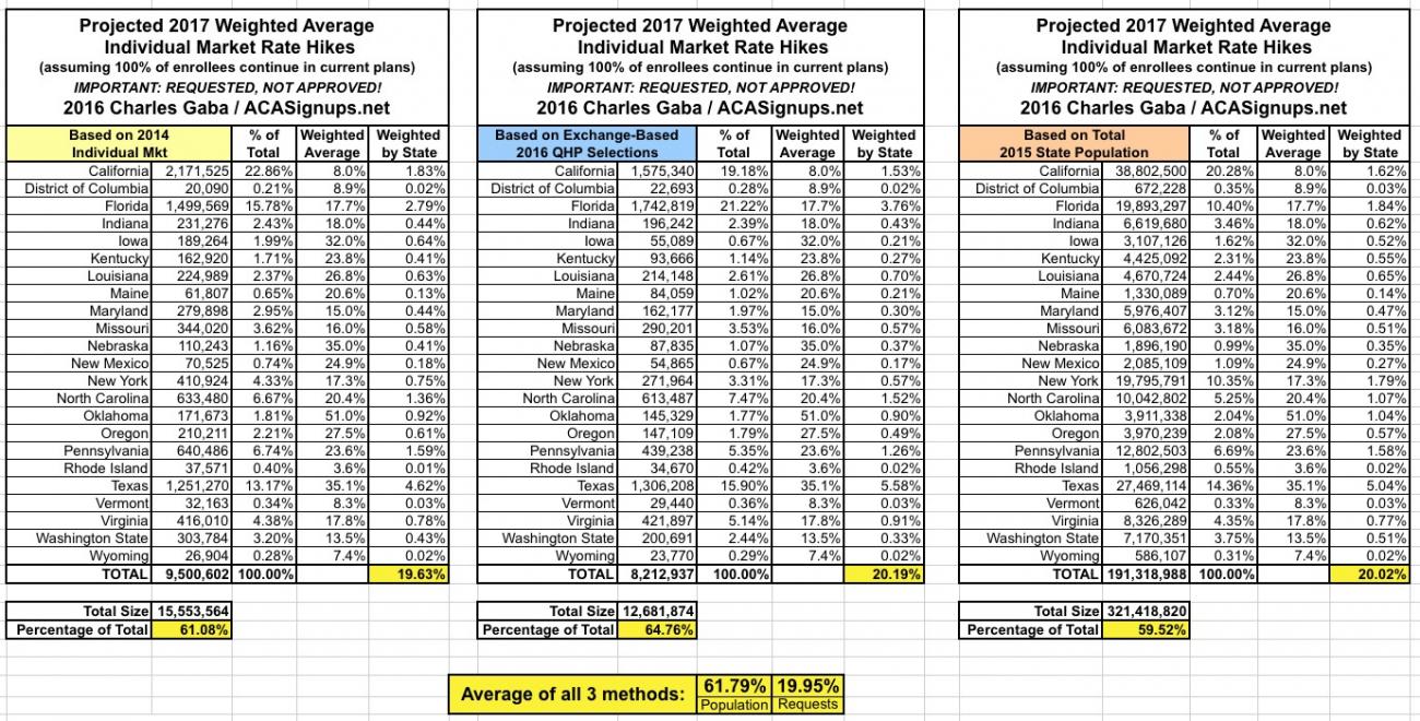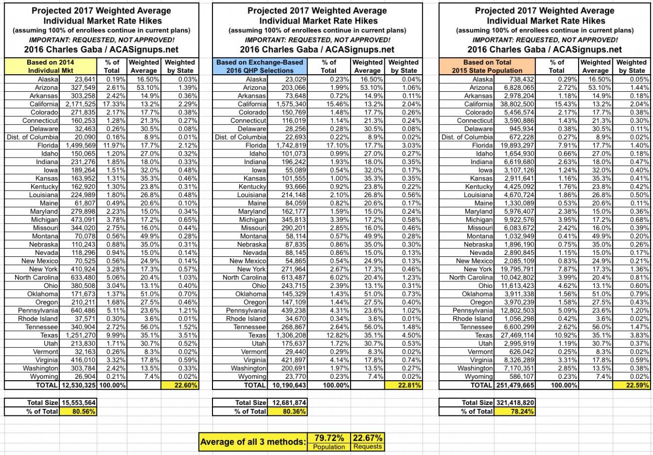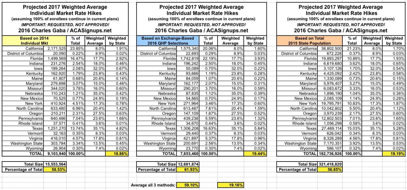 Since there are a lot of demographic variables which can skew the "average" up or down for any given state, last year I plugged the averages for each state into tables and weighted them based on 3 different criteria: The total (on plus off-exchange) individual market (based on 2014 data); the total exchange-based QHP selections as of the end of Open Enrollment; and the total population of each state. However, the 2014 data is too outdated by now (the national indy market has grown from around 15.6 million to around 20-21 million by now), so until the Kaiser Family Foundation or another trusted source compiles 2015 data, I'm dropping that method. Besides, all three methods still hovered in the same 12-13% range last year anyway.