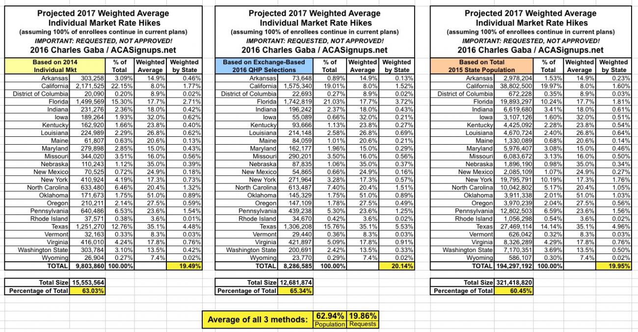 Regular readers know that I spent countless hours last summer tracking down the requested average 2016 rate change filing forms for every single state in the country, and then compiling them into my best guesstimate about the overall, weighted average rate changes for the individual policy market in each state and nationally.