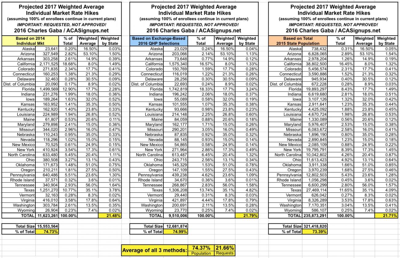 UPDATE 7/23/16OK, with the addition of Georgia, I now have 37 states representing 84% of the total population, with a nationally weighted average rate hike request of 22.9%.