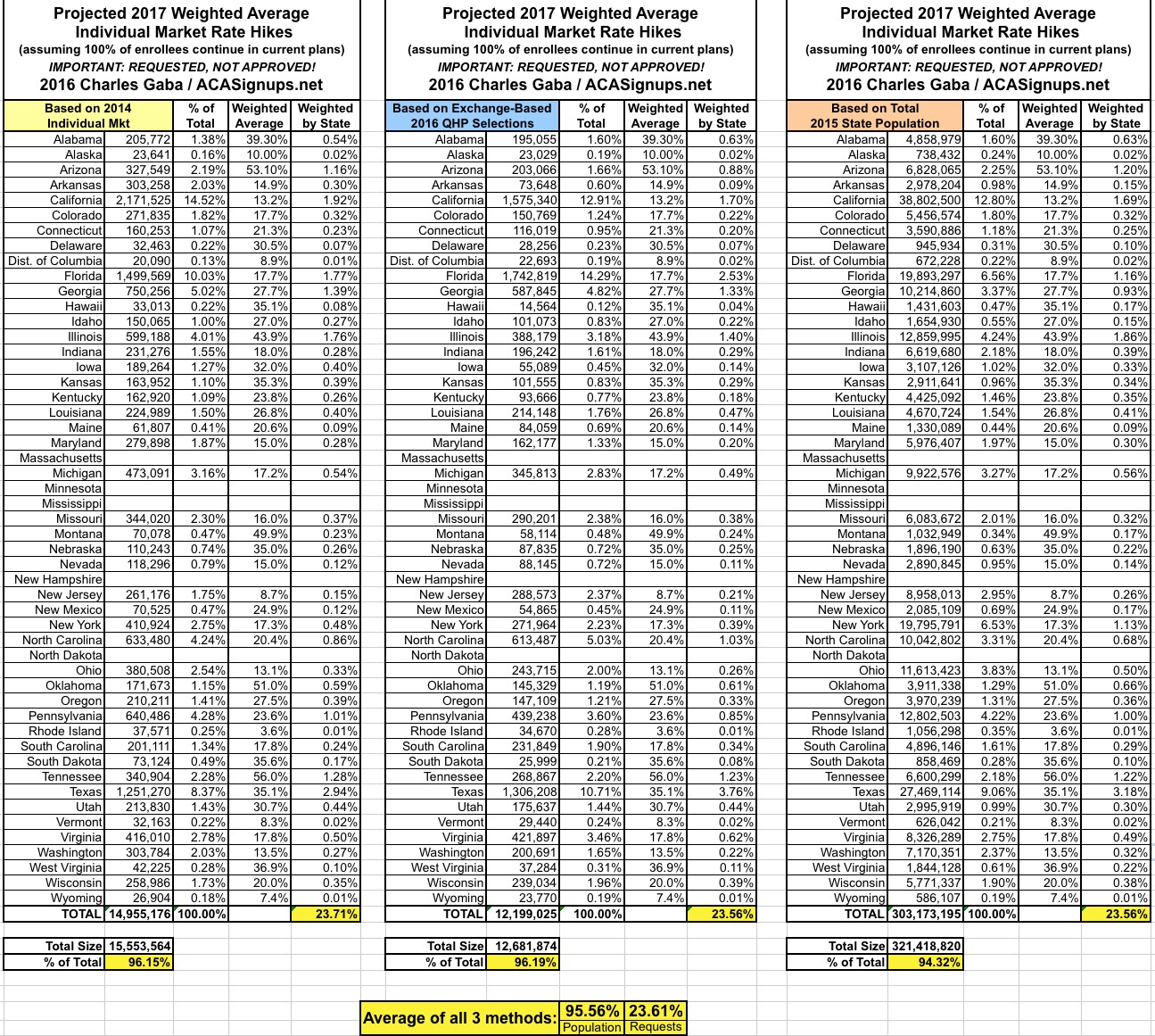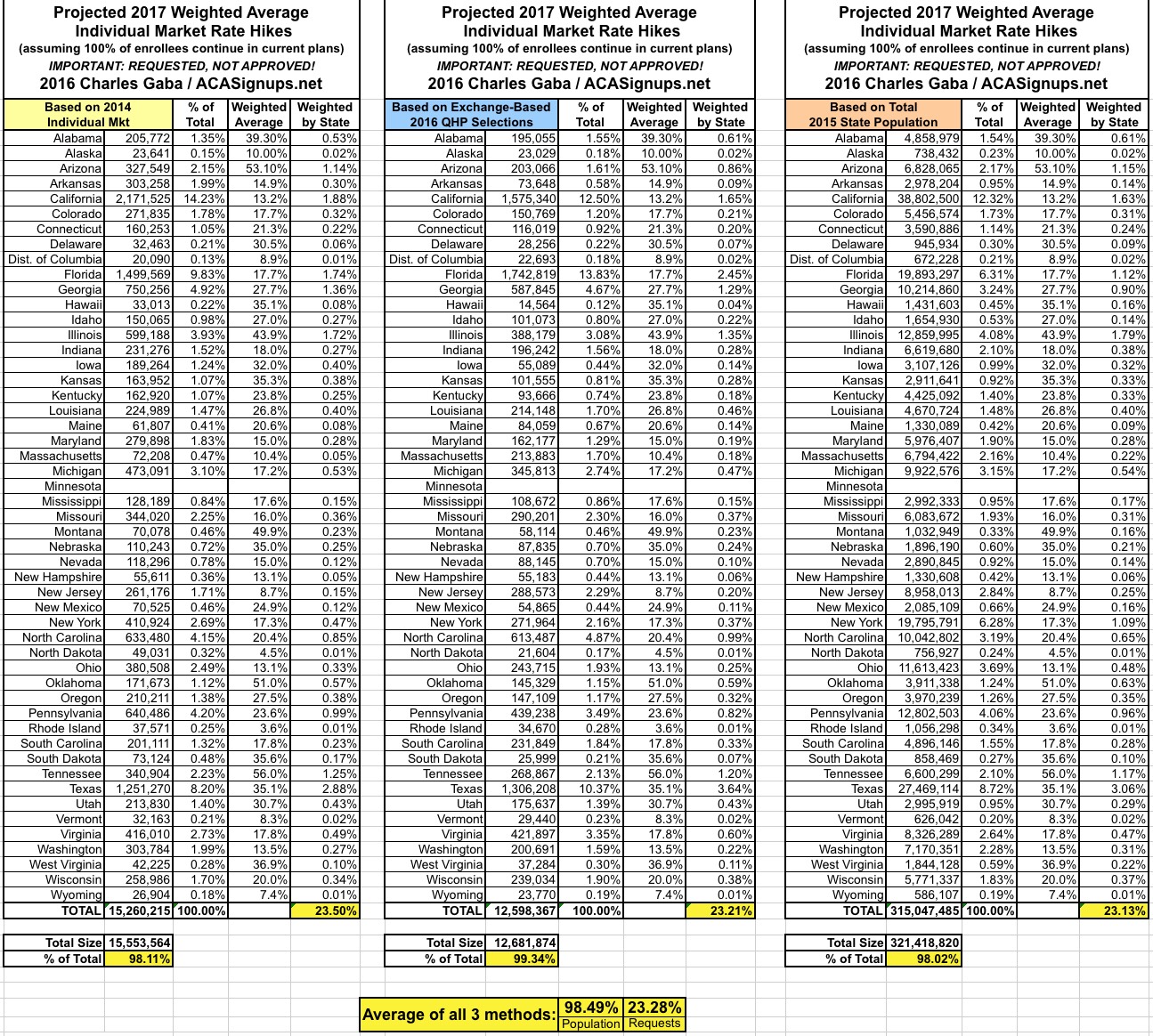 With these six states added, I've now accounted for over 93% of the total population, with a national weighted average requested rate hike of 23.2%: