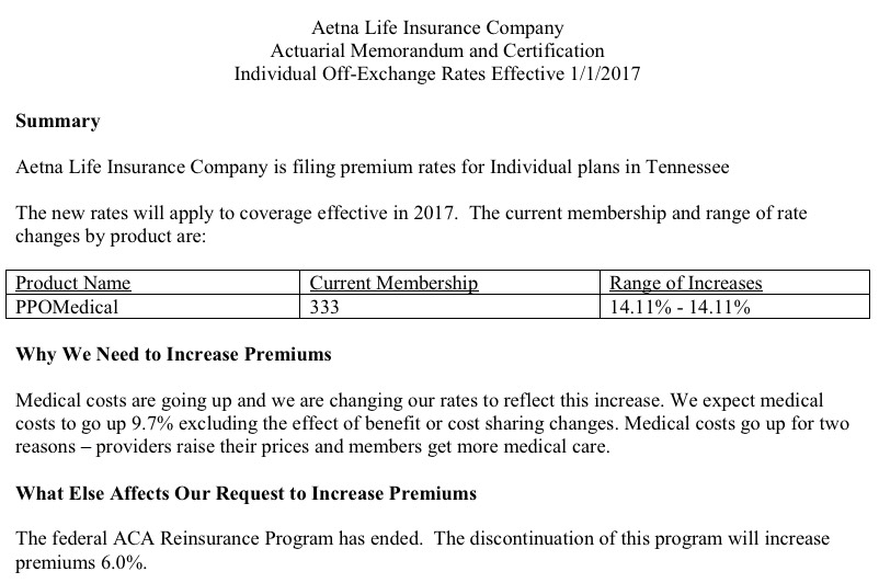 Put 'em together and...ugh. 56%. Assuming the rate requests are approved at levels close to what has been requested, unsubsidized Tennessee residents are looking at pretty ugly rate hikes next year. As always, we'll see how the regulators respond.