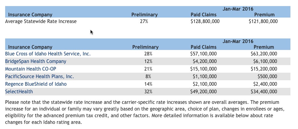 The Idaho insurance department website has made this really easy for me. Most states either don't provide the requested rate hikes at all (forcing me to track them down via a slew of SERFF filing forms) or, if they do provide the rate requests, they don't provide the actual enrollment numbers for each carrier, making it very difficult to run a weighted average.