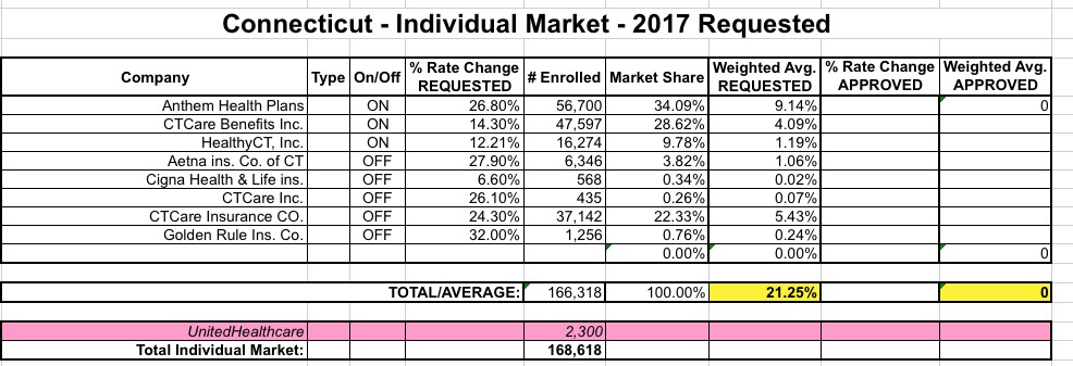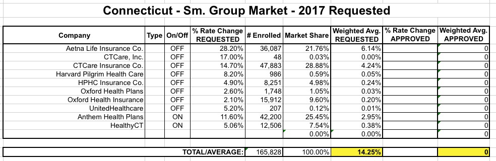 Thanks to commenter "Junaed S" who directed me towards this simple, cut 'n dry PDF from the Connecticut Dept. of Insurance detailing the requested rate hikes for the CT individual and small group markets for 2017: