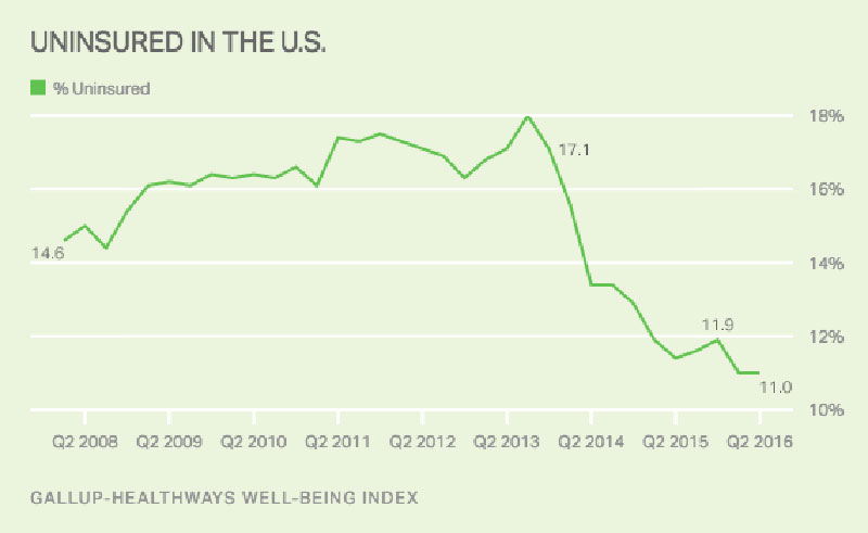 As they do every three months, Gallup has released their quarterly survey results regarding the number of uninsured American adults.